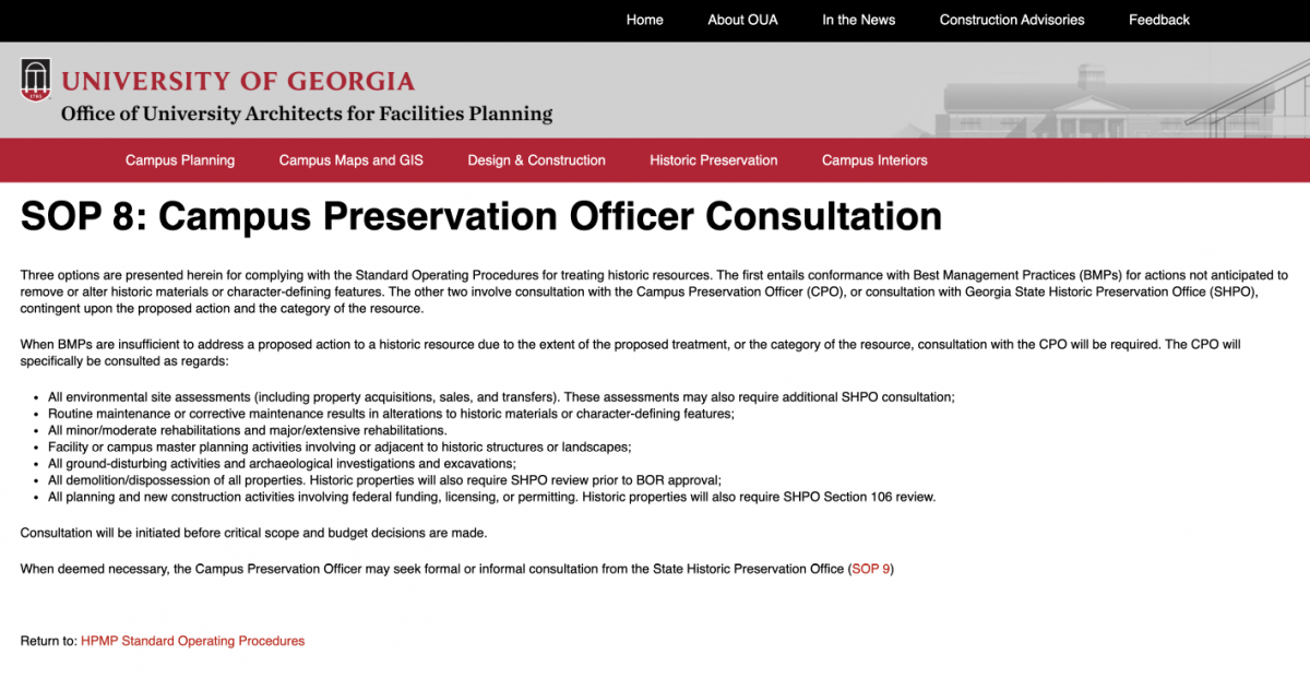 All historic resources identified in the Historic Resource Inventory (HRI) have been assigned an Assessment Category that takes into consideration the age, history, context, significance, condition and integrity of buildings and landscape features, and suggests National Register of Historic Places eligibility and other potential significance using five classifications (1, 2, 3, 4, and 5). The Assessment Category for specific University of Georgia resources may be found on the Summary with Tabular Identification and Evaluation of Cultural Resources section found in the appendix of this Historic Preservation Master Plan. Summaries are arranged by campus association, character area, and building number, with landscape resources following buildings in each character area. The Assessment Category of a building or landscape resource may also be obtained by contacting the Campus Preservation Officer (CPO) (see SOP1) or clicking on a building in the UGA HPMP interactive campus map.